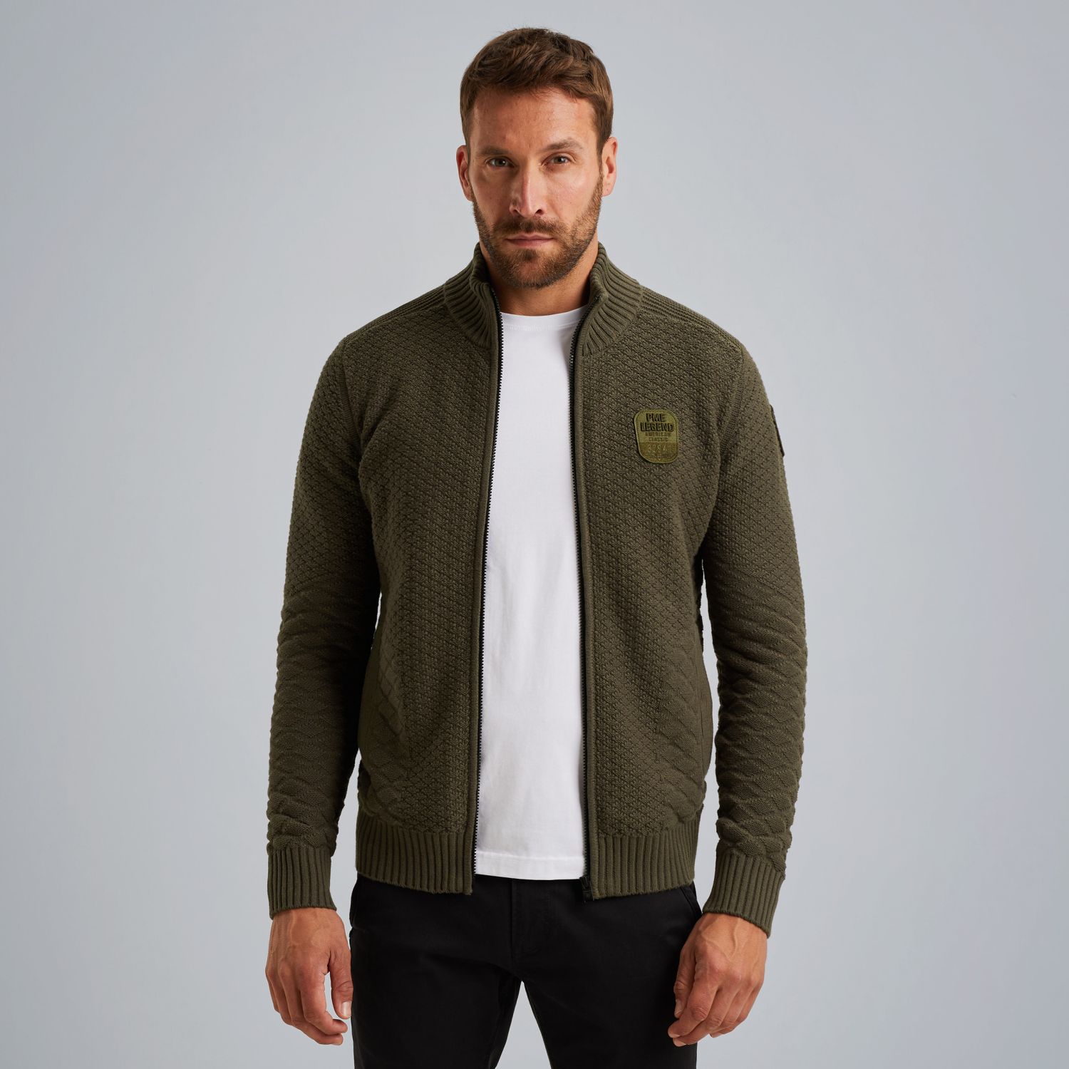 Кардиган с различными фактурами для более грубого вида, высокий ребристый стоячий воротник и боковые карманы на кнопках. На груди и рукаве расположены фирменные нашивки, которые завершают дизайн. Он придаёт образу практичную мужественность и чувство надёжности.