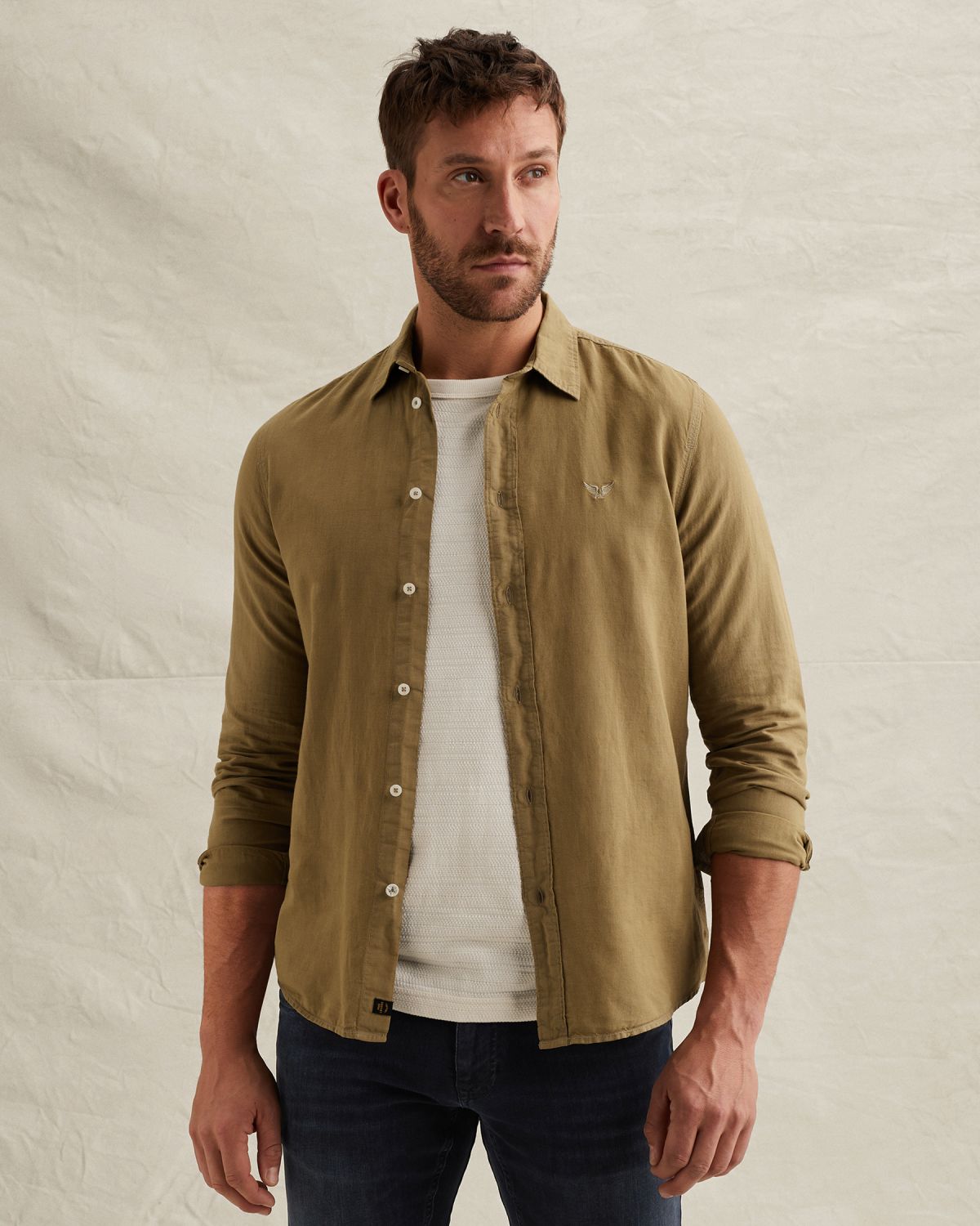 Рубашка из смеси хлопка и льна с окраской в готовом изделии. Уход: не отбеливать, не сушить в сушильной машине, не гладить, химчистка запрещена