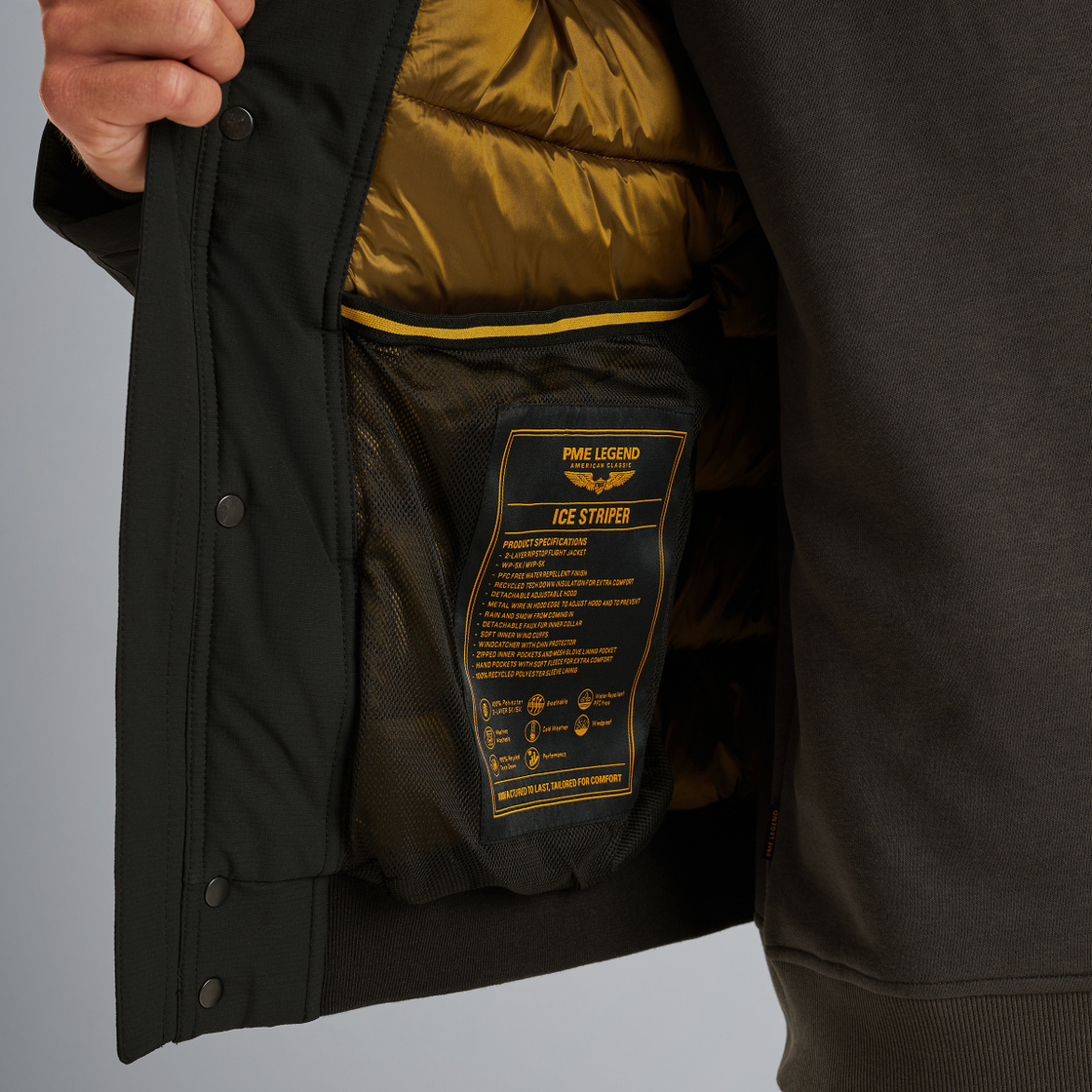 Куртка PME Legend Ice Striper вдохновлена аутентичными лётными куртками и выполнена из прочного рипстопа. Съёмный внутренний воротник из искусственного меха, ребристые манжеты и пояс, а также наполнитель Tech Down обеспечивают тепло и комфорт. Лёгкая, водоотталкивающая куртка с ветрозащитной планкой и съёмным капюшоном идеально подходит для холодного сезона.